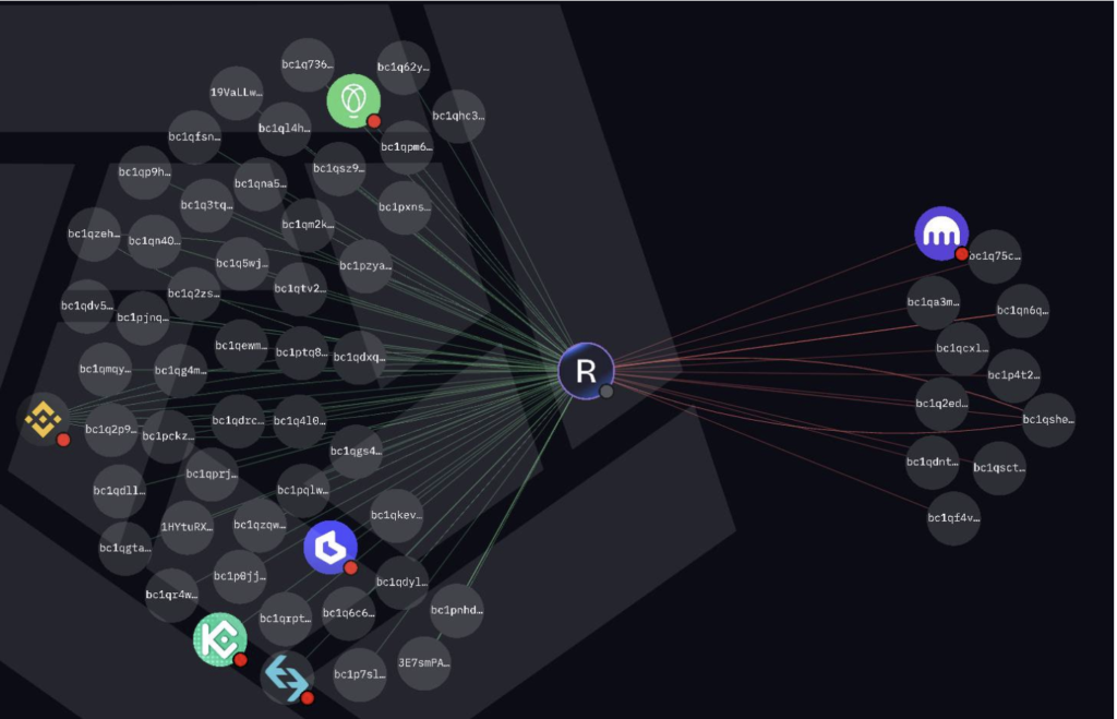 A visualisation of the crypto transactions flowing in and out of just one of Radom’s many intermediary wallet addresses used to process crypto donations to Reform UK. We have only been able to verify that one of the inflowing strands to this wallet is a political donation, the others could be related to Radom’s other clients. Credit: Arkham Intel