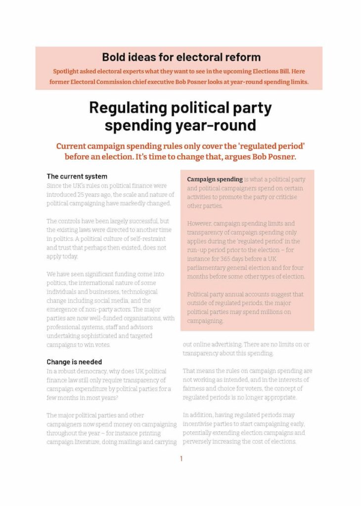 The major political parties and other campaigners now spend money on campaigning throughout the year – for instance printing campaign literature, doing mailings and carrying out online advertising. There are no limits on or transparency about this spending.