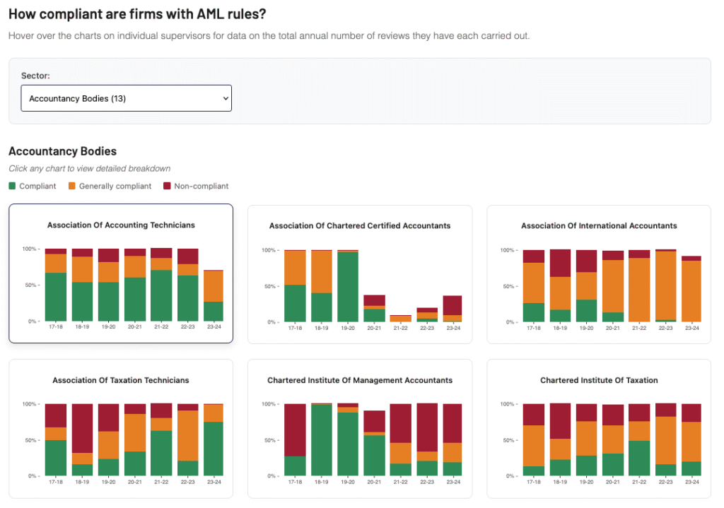 In the accountancy sector, the Association of International Accountants (AIA), which has found an average of just 13% of its firms to be fully compliant, has responded in the last two years with a significant uptick in formal actions, going from issuing just 2 in 2021/22 to 35 in 2022/23 and 41 in 2023/24.